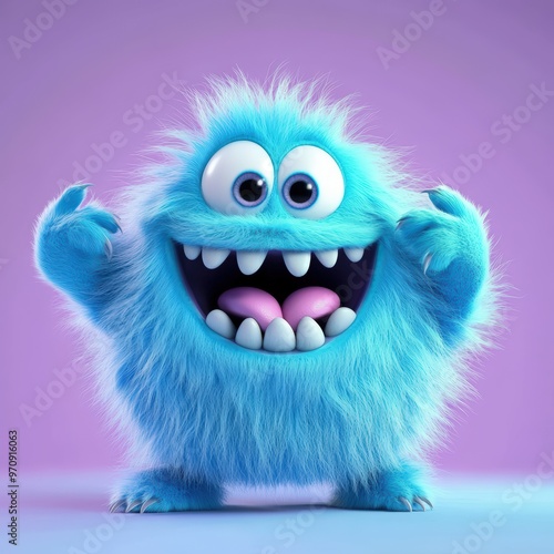 Cute and furry blue monster with good character, Big eyes and smile. studio render quality. Cartoon style.