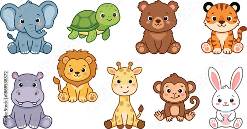 Cute Baby Animals Cartoon Set Elephant Turtle Bear Tiger Lion Giraffe Monkey Rabbit Hippo Kawaii Style Kids Friendly Vector Illustration
