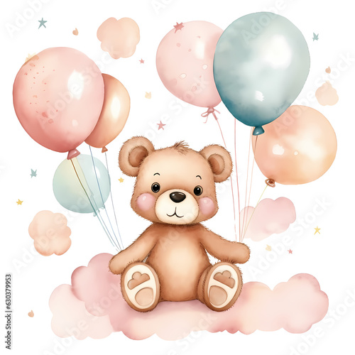Cute Baby Bear And Balloons Watercolor Clipart