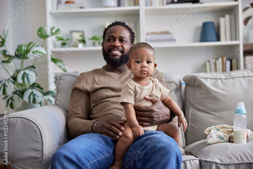 Cute baby sitting with father on sofa at home
