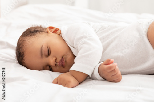Cute Baby Toddler Sleeping Peacefully Lying In Bed At Home
