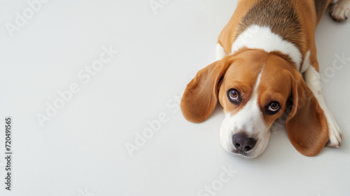 Cute beagle dog laying on white floor with floppy ears, hound dog looking at camera, shot from above, room for type, pets, pet care, dog training, puppy training, family pet, and veterinary concepts