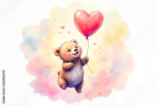 Cute bear with a heart-shaped balloon expressing joy on a colorful background
