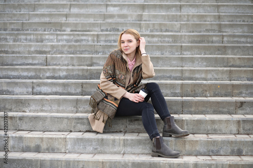 Cute blonde in the city drinking coffee