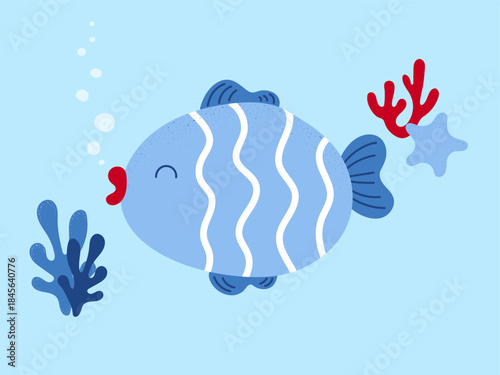 cute blue fish illustration with soft shapes, playful stripes, and coral elements on a light background. cheerful underwater design for children’s projects, marine themes, educational materials