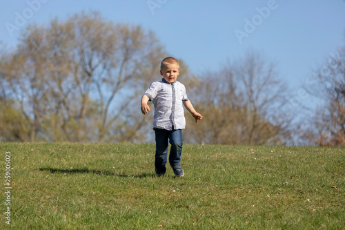 Cute boy running across grass und smiling.