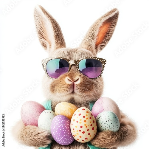 Cute bunny with sunglasses holds Easter eggs