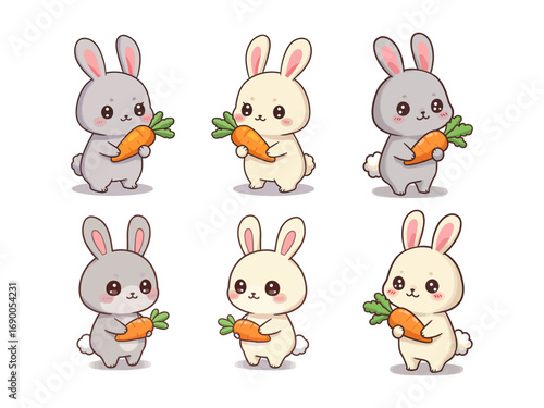 Cute cartoon bunnies holding carrots joyfully
