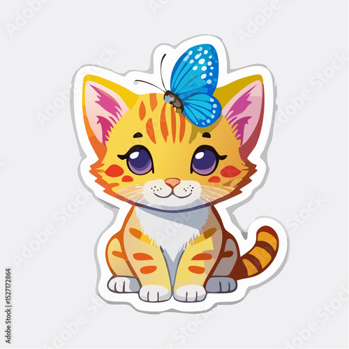 Cute cartoon kitten with butterfly on head, drawn in bright color with big eyes and sweet expression.