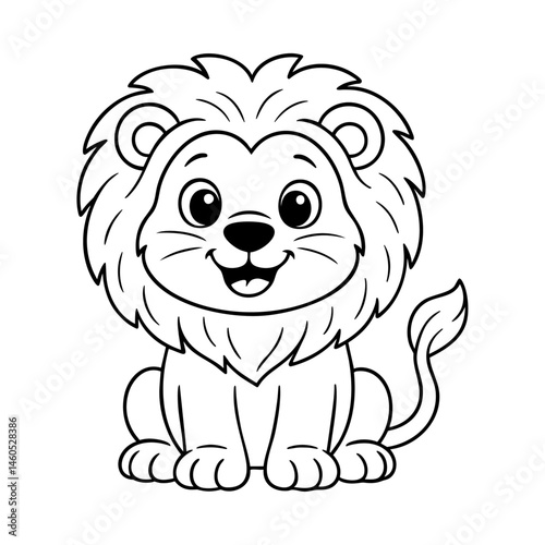 Cute cartoon lion illustration for kids, black and white jungle animal line art, smiling baby lion drawing for coloring book or educational materials