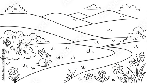 Cute cartoon meadow with mountains, mouse deer and river. Coloring pages for kids