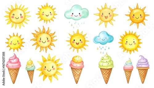 Cute cartoon suns and clouds with ice cream