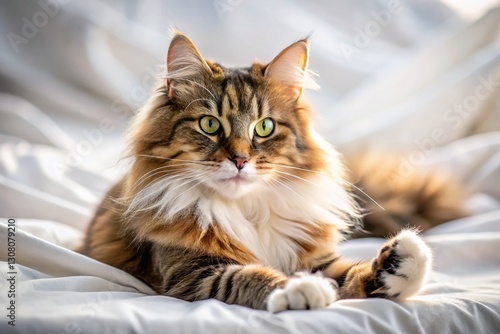 Cute Cat Grooming Itself on a White Bed – Adorable Pet Stock Photo