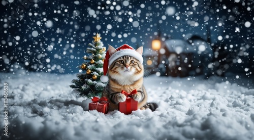 Cute Cat in Santa hat on Christmas tree. Funny Cat in red Santa hat with Christmas gift on winter snow greeting card. Cat in Christmas Santa hat near snow winter outdoor. New Year banner.