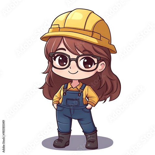 Cute chibi girl in a hard hat and overalls, engineer cartoon illustration