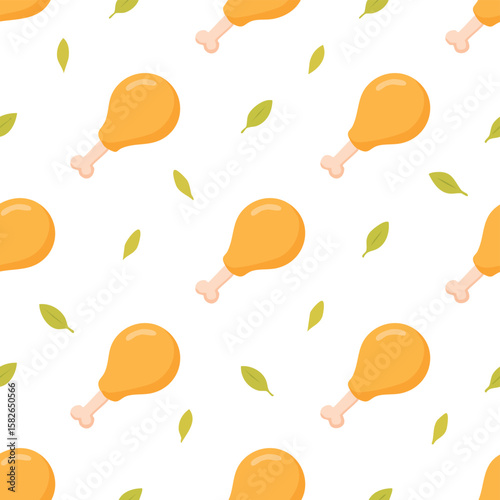 Cute chicken drumstick pattern with green leaves on white background fried chicken