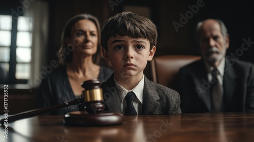 Cute child and mother at table with gavel of judge blurred in background, family law concept