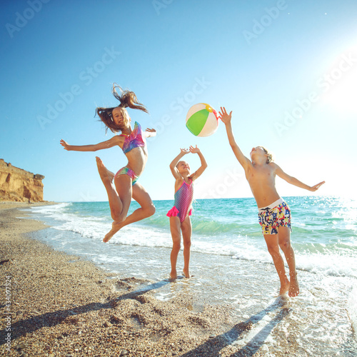 Cute children enjoying sunny day at beach. Summer camp. High quality photo