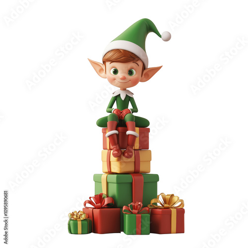 Cute Christmas Elf Sitting on Colorful Gift Boxes with Cheerful Expression