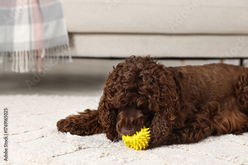 Cute Cocker Spaniel dog with toy on floor at home, space for text