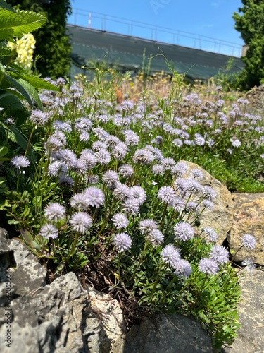 Cute delicate purple blooming Globularia cordifolia with lots of fluffy inflorescences in a rocky garden.plants for rock gardens and stony habitats. Flower background