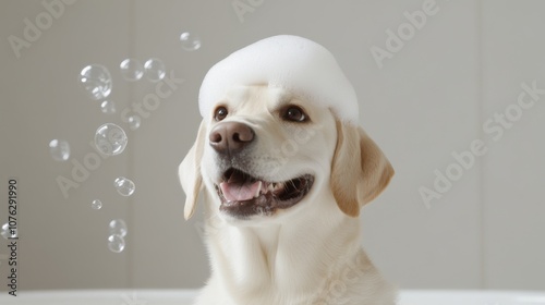 Cute Dog in Bathtub with Bubbles and Soap on Head, Smiling in Funny Style, High-Definition Photography
