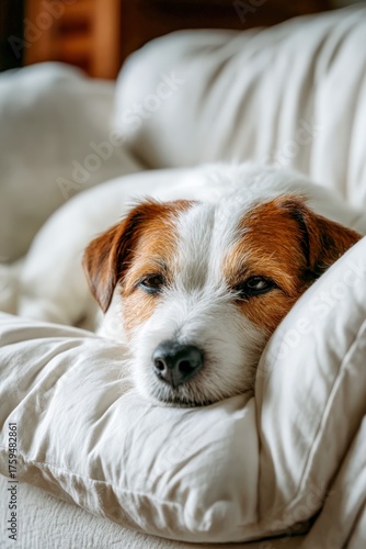Cute dog relaxes comfortably on a soft armchair in a cozy living room