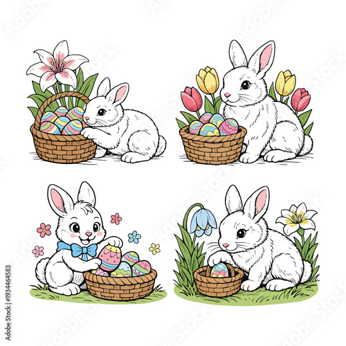 Cute Easter Bunny Vector Set: White Rabbits with Wicker Baskets, Colorful Eggs, and Spring Flowers Illustrations