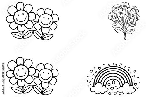 Cute Flowers and Rainbow Line Art Illustration Set – Spring Coloring Pages