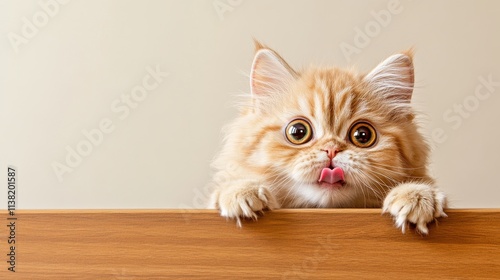 Cute fluffy cat peeking over a table with curious expression and playful demeanor.