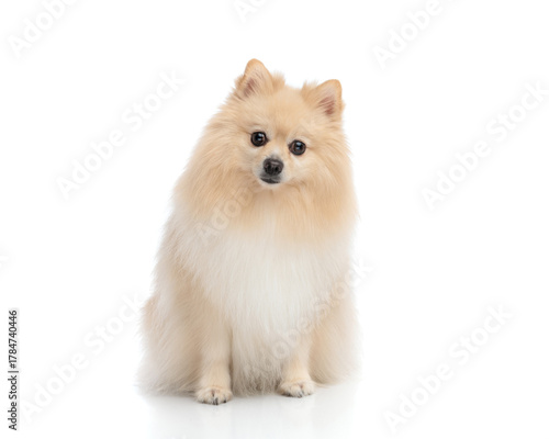Cute fluffy pomeranian dog sitting and staring