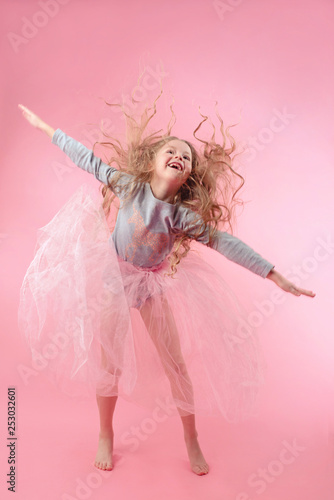 cute funny little girl with long blonde hair jumping on pink background