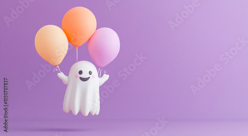 Cute ghost character floating with colorful balloons on a purple background. 3D illustration for Halloween.