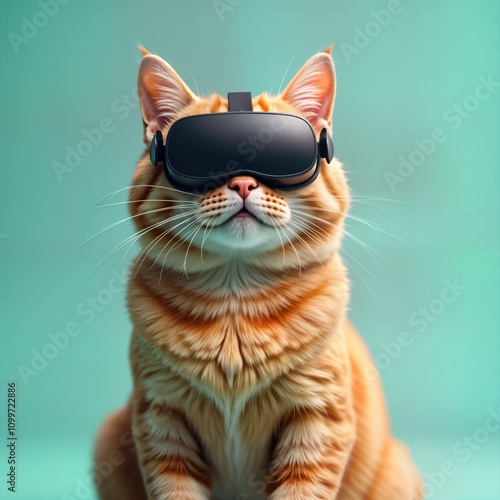 Cute ginger cat wearing VR glasses. Animal enjoys virtual reality tech. Fun modern tech concept. Pet tech. Digital entertainment. Home scene. 3D rendering. Cyber space concept. Cat looking at