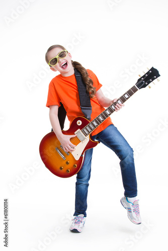 Cute girl plays on the electric guitar.