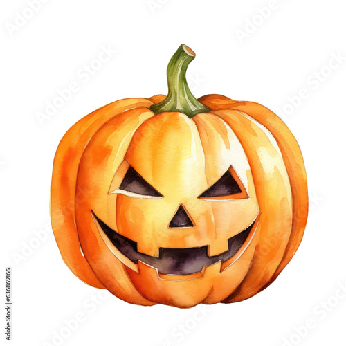Cute halloween pumpkin watercolor style. Halloween pumpkin head jack lantern with scary evil face, png transparent background.