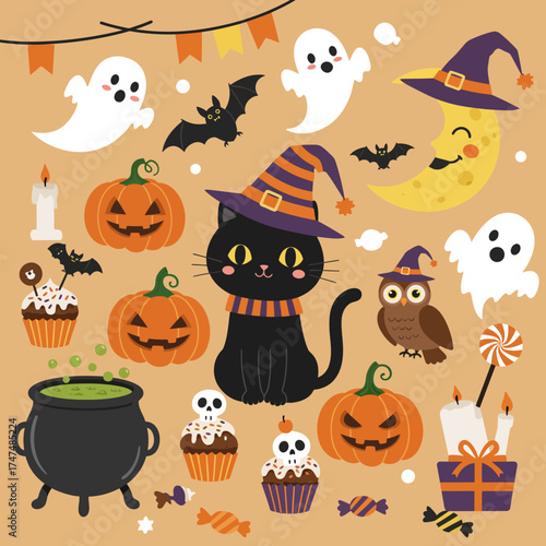 Cute Halloween Vector Elements Collection with Black Cat, Ghosts, Pumpkins, and More