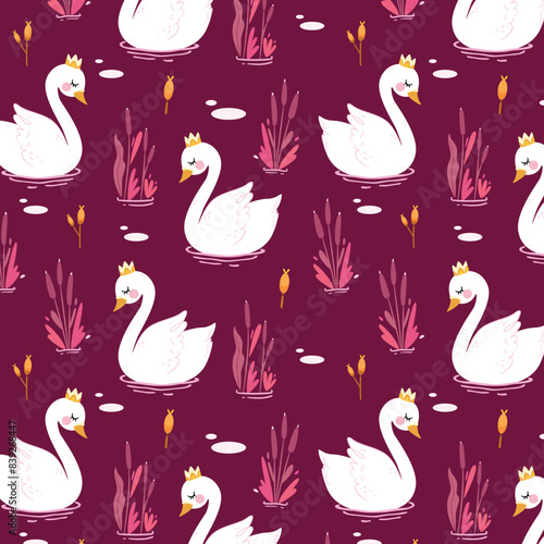 Cute hand drawn Swan and Flowers - vector print. Seamless pattern with cartoon swan, flowers, leaf