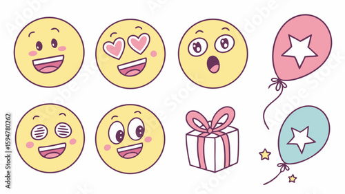 Cute hand-drawn emoji and party elements vector set with happy, love, surprised faces, balloons, and gift box for celebration designs