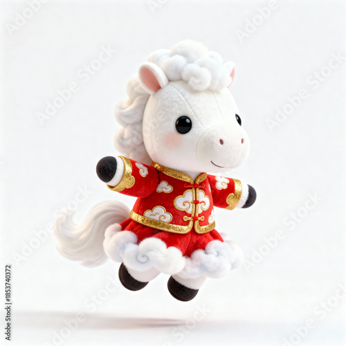 Cute horse chinese new year 3d character plush happy cartoon mascot red gold festival celebration zodiac animal toy stuffed soft fur fluffy white mane tail costume traditional outfit embroidery