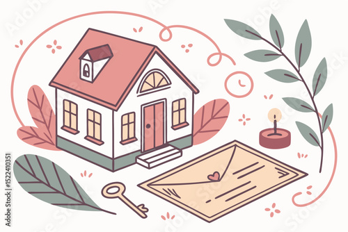 Cute house illustration with envelope key and candle decorative elements suitable for design projects