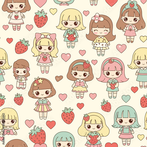 Cute Kawaii Girls and Strawberries Seamless Pattern 12. Vector Illustrations. EPS Editable