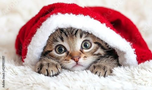 Cute kitten in Santa hat on fluffy blanket, holiday pet photo