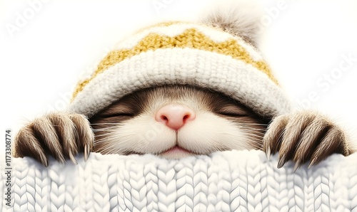 Cute kitten wearing winter hat peeking over knitted fabric.