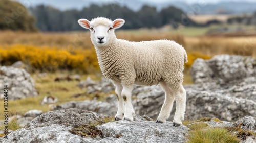 Cute lamb standing on rocks in a field.