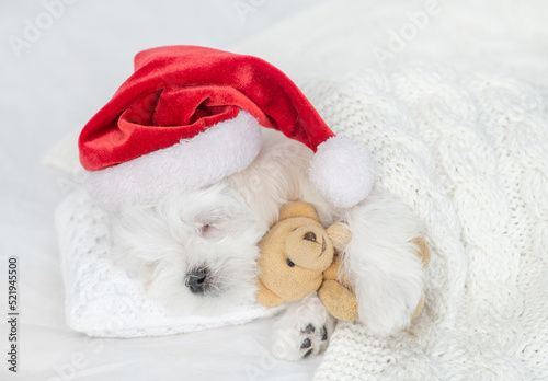Cute Lapdog puppy wearing red santa hat sleeps and hugs toy bear under white blanket at home. Top down view