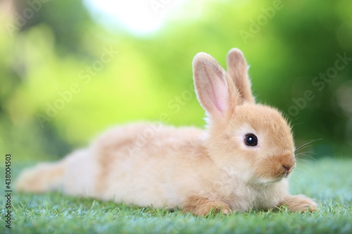 Cute litte rabbit on green grass with natural bokeh as background. Young adorable bunny playing in garden.