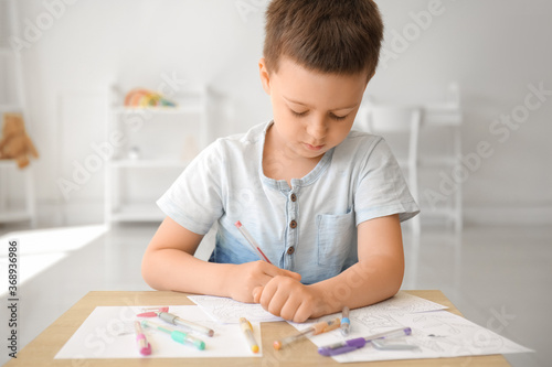 Cute little boy coloring pictures at home