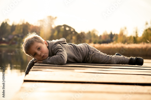 cute little caucasian boy pretending catching fish in lake laying on wooden pier in the countryside. Image with backlight, toning and selective focus