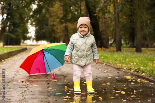 Cute little girl standing in puddle near colorful umbrella outdoors